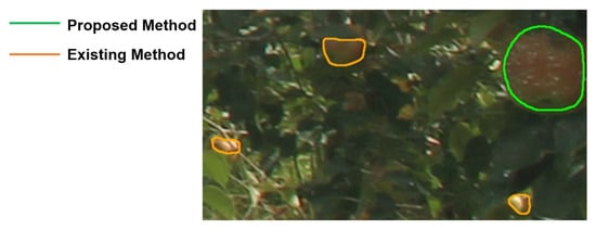 Example of hidden fruit detection. The proposed model can accurately detect hidden regions caused by fruit leaves, branches, and shadows. The orange line is the result of the COCO as an existing method, and the green line is the result of the proposed method.