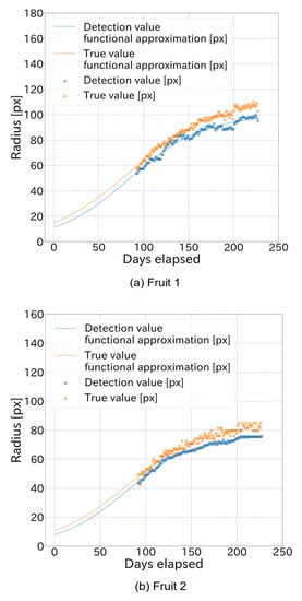 True radius values and detected radius values for each elapsed day. The growth curves derived from the true and detected values up to 227 elapsed days. In Fruit 1, a, b, and c in the functional approximation of Equation (4) are a = 99.71, b = 7.848, and c = −0.024 for the detection value curve and a = 112.24, b = 6.428, and c = −0.021 for the true value curve. In Fruit 2, a = 76.61, b = 8.595, and c = −0.027 for the detection value curve and a = 84.93, b = 7.001, and c = −0.024 for the true value curve.