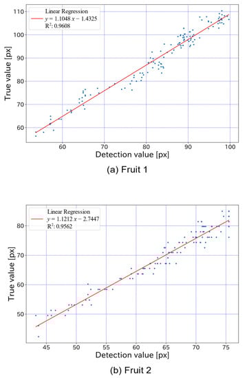 - In real-time fruit radius measurements, the MAPE of the true and detection values was less than 0.079, and the coefficient of determination for linear regression was more than 0.95 for both Fruit 1 and 2, indicating that the fruit radius can be measured with high accuracy.