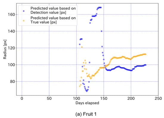 In the validation of the real-time prediction of the fruit radius at harvest, the respective predictions obtained from the detection and true values were compared with the correct harvest radius. In the derivation of the predictions, the detection and true values at the number of elapsed days were used to identify each coefficient in Equation (3) using the least squares method, and the growth curve for each elapsed day was derived. For the derivation of the correct harvest radius, a growth curve was derived based on all true values for elapsed days 1–227, assuming 227 days to be the optimum harvest time. Each predicted value and the correct harvest radius were the convergence values of these growth curves.