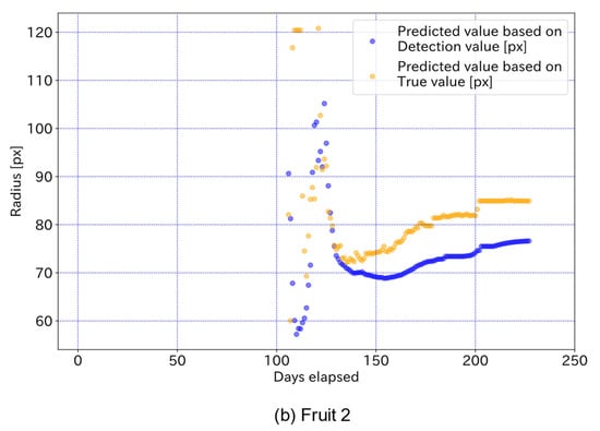 Figure 16 shows the fruit radius at harvest predicted from the true and detected values for each elapsed day. Each prediction can capture the relative growth curve that approaches the value of the true curve after approximately 150 elapsed days, even if the target is partially hidden. However, before 150 days, the predictions varied widely and had relatively large errors. This suggests that the number of samples for prediction was not sufficient up to approximately 150 days. In addition, observations from the early stages of growth are required to ensure a sufficient number of samples. Furthermore, it is difficult for the proposed method to predict the radius of harvested fruit before 150 days have elapsed, and further improvement of the growth model and prediction algorithm is required for an early prediction. Moreover, in order to avoid the large amount of processing in the study, the validation was limited to two representative fruits that were detectable over a long period of time. Therefore, although the difference in accuracy of growth prediction between the different models is not clear, it can be expected from Table 2 that the proposed model will improve prediction accuracy over the conventional model when all fruits in the image are targeted.