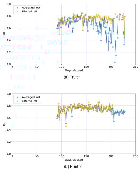 Filtered IoU and averaged IoU of each fruit for each elapsed day. The filtered IoUs indicate the IoUs of the fruit recognized as the same fruit by the proposed detection algorithm shown in Figure 5. The averaged IoU shows the mean value of the IoU of all fruits with the correct and overlapping regions. Although the averaged IoU of Fruit 1 is lower than that of Fruit 2 for most elapsed days due to overlaps with other fruits and leaves, the filtered IoUs of Fruit 1 and Fruit 2 are equivalent. The averaged and filtered IoUs are similar in Fruit 2 because there is little overlap with other fruits and leaves.