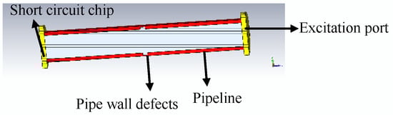The microwave detection model of TE01 mode small-diameter pipeline is established to test the ability of microwave to detect defects on the inner wall of the pipeline. The distribution of electric field, magnetic field, and pipe wall current in the pipeline is analyzed, and the influence of defects on the electric field and magnetic field current propagation in the pipe wall is analyzed. The simulation model is shown in Figure 3.