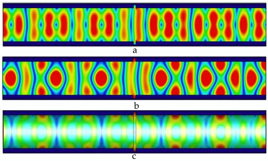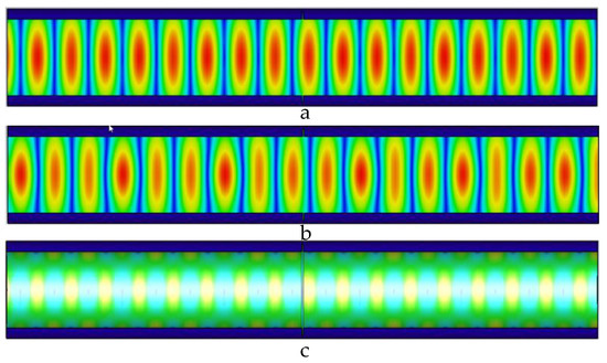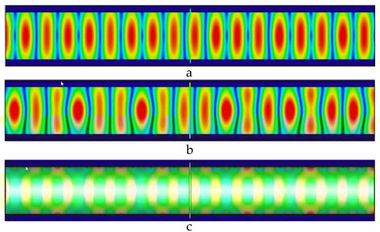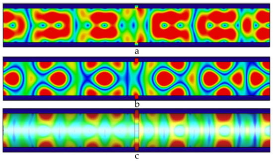 The microwave in the pipeline propagates along the axial direction of the pipeline. When there is no defect in the pipeline, the microwave propagates periodically in the pipeline; when there is a defect in the pipeline, the defect destroys the microwave that propagates periodically in the pipeline, and the energy is lost at the defect, and defects in pipes can be detected. Distribution of electric field, magnetic field, and pipe wall current in the pipeline without defects is shown in Figure 4.