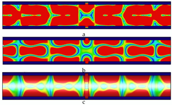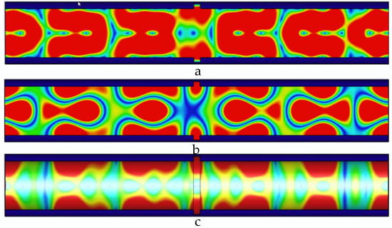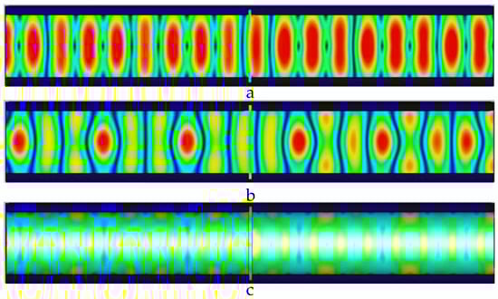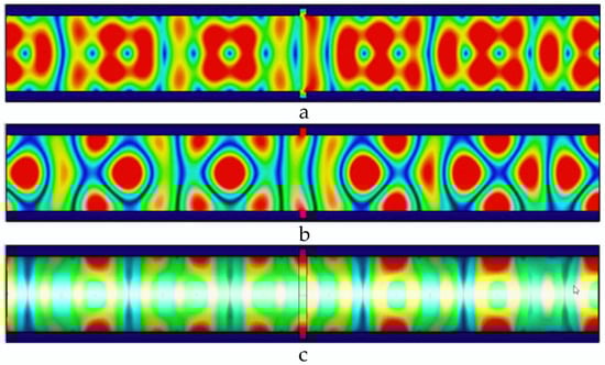As shown in Figure 9, the defect width is 5 mm, the number of microwave propagation cycles in the pipeline decreases, the single-cycle microwave energy distribution in the pipeline is uneven, a complete propagation cycle cannot be formed at the defect, and the energy is concentrated, resulting in a large energy loss.
