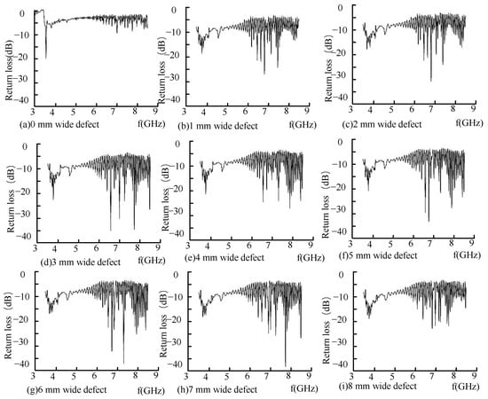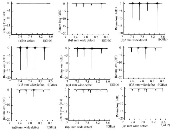 As shown in Figure 13a, when there are no defects in the pipeline, the inner wall of the pipeline is smooth, and the microwave forms a total reflection through the short-circuit plate in the pipeline. There was no energy loss in the pipeline; the return loss was zero, and the reflection coefficient was one. At this time, the incident wave electric field was equal to the reflected wave electric field. When there is a defect in the pipeline, the energy in the pipeline is attenuated, and the return loss occurs at the defect, as shown in Figure 13b–i, and the microwave reflected wave is detected in the TE01 mode as the width of the defect in the pipeline increases. There are multiple echo signals; the detection frequency of the echo signal is shifted in frequency, and the detection frequency shift at defects of different widths is shown in the Figure 14.