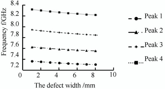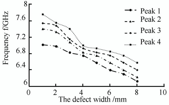 As shown in Figure 14, in the process of TE01 mode microwave small-diameter pipeline inspection, the microwave reflected wave has four peaks of the microwave echo signal with the appearance of the defect. As the defect width increases, the microwave detection frequency at the peak of the microwave echo signal decreases linearly, and the defect width increases with a step size of 1 mm. In TE01 mode, setting the appropriate propagation frequency in the actual detection process can detect defects of different widths in the pipeline.