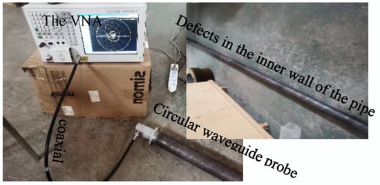 An experimental platform for microwave detection of TE01 mold small-diameter pipes was developed. The experimental platform consisted of a vector network analyzer, coaxial cables, pipes with inner wall defects of different widths, and waveguide probes. The width of the defect on the inner wall of the pipeline was 1–8 mm, the depth of the defect was 5 mm, the diameter of pipe was 66 mm, and the length of the pipeline was 4 m. The microwave propagation frequency is 3.5 GHz–8.5 GHz in the experiment. The experimental platform for small- diameter pipeline inspection is shown in the Figure 15.