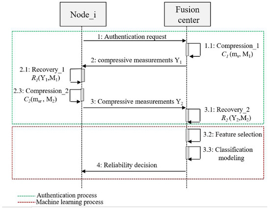 We considered a centralized cooperative CRN with I nodes classified into Z normal nodes (SUs) and L abnormal nodes (MUs), which cooperate with an FC to perform the spectrum sensing process. Before reaching the final decision about the spectrum occupation, all CRN users, including SUs and MUs, initially performed a double authentication process based on compressive sensing technique [23,24], combined with a machine learning approach to confirm their reliability. Then, once the corresponding FC has successfully completed its classification, each user identified as a trusted user is automatically allowed to start the spectrum sensing process. Figure 2 presents the main processes of the new proposed technique, namely the authentication process and the machine learning process. In the authentication process, we assumed that the reliable nodes and the FC share two secure pre-shared matrices, and , which are generated using a Chebyshev map [25]. These chaotic sensing matrices are used as a security key to distinguish between normal and abnormal nodes [26]. The proposed double authentication process involves two steps. The first step performed is the compression of a random sparse signal at the FC, followed by a recovery of the same signal at the node using the same sensing matrix . The second performed step is a compression of the recovered signal at the node followed by a second recovery at FC using the same sensing matrix . More details regarding the double authentication process are described in our previous work [22]. In the machine learning process, three main steps are performed by the FC, namely feature selection, classification modeling, and node reliability decision. At the feature selection step, the FC gathered different features based on the received compressive vectors from all nodes ( and ) to build its dataset. At the classification-modeling step, the model is generated, trained, and tested using individual or ensemble machine learning algorithms [27]. At the decision step, the FC is able to recognize whether the node is a SU or MU, and finally decides to accept or reject it. The following sections describe in detail the approach adopted for the machine learning process.
