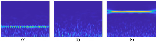 An alternative to overcoming these issues is to formulate the spectrum sensing process as an image classification problem with a binary hypotheses (: vacant band or : occupied band) using deep learning, especially with CNN models for automatic features extraction. In other words, the received signal can be processed as an image of 2D (time-frequency) for better spectral analysis. The scalogram image is an adequate solution for visualizing this time-frequency representation of a signal. It displays the variation of the absolute value of the continuous wavelet transform (CWT) of a signal over time and frequency. In addition, the scalogram provides an accurate frequency localization for long-duration signals with low frequency, as well as a good temporal localization for high-frequency and short-duration signals. Regarding the hardware aspect, coherent detection techniques such as energy-based detection (using in-phase and quadrature (I/Q) data) require hardware that is more complex than that used for the processing of spectrogram/scalogram images [36]. Figure 4 presents examples of a scalogram of different cases.