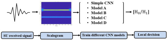 A scalogram-based CNN models technique for spectrum sensing involves two main processes. The first process aims at transforming the received signal (1D) to a scalogram (2D) using CWT. The second process operates the training of several CNN models with the scalogram images obtained in the first process as the input, as shown in Figure 5.
