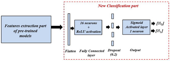 To examine the efficiency of the scalogram-based spectrum sensing technique, we performed a comparative study between two approaches based on different CNN models. In the first approach, we explored a basic CNN model without the transfer learning method [42]. In the second approach, we investigated four different CNN models based on the transfer learning method; namely, model A, model B, model C, and model D. Each model is designed based on four popular pre-trained models, namely, VGG16 [43], inceptionV3 [44], efficientNetB0 [45], and DenseNet201 [46], respectively. The purpose of this approach is to re-configure and train only the classification part of each model, while the features extraction part remains the same un-trained, as shown in Figure 7; i.e., the last layers of each pre-trained model are dropped and fine-tuned by two new layers close to the classification layers of the simple model. These two layers are a fully connected layer of 16 hidden neurons with ReLU activation function, a dropout rate of 0.2, a decisive fully connected layer with one neuron, and Sigmoid activation function for a binary classification (/label 1 for the presence of the PU signal, or /label 0 for the absence of the PU signal).