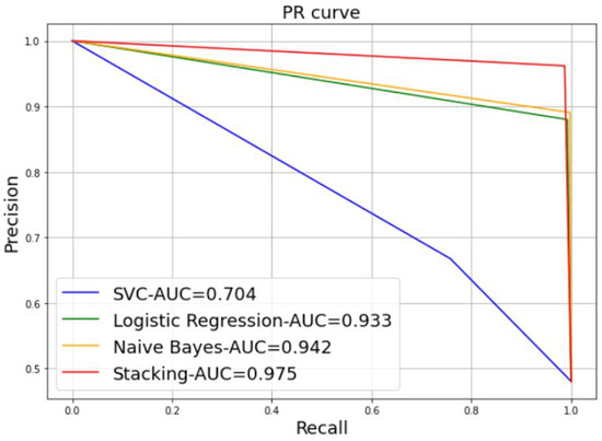 A further alternative for comparing the performance of the different models is via a curve-based comparison, including the Precision-Recall (PR) curve. Figure 8 represents an example of a PR curve, where the precision scores are plotted on the y-axis as a function of the recall scores on the x-axis. It illustrates the trade-off between precision and recall for various thresholds. The highest precision and recall values are desired to achieve a high model performance; in other words, the appropriate PR curve has the greatest area under curve (AUC). In Figure 8, the stacking model provides the best performance results, with 97.5% of the AUC, followed by the NB model with 94.2% of the AUC, the LR model with 93.3% of the AUC, and SVM with a low value, 70.4% of the AUC.