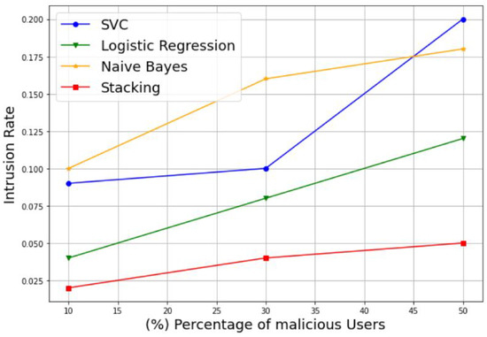 In addition, to evaluate the robustness of the proposed model in the presence of varying percentages of MUs, we plotted the authentication rate and intrusion rate of the SVM, LR, NB, and stacking-based models against different percentages of malicious users, including 10%, 30%, and 50%. Example of the results are presented in Figure 9 and Figure 10. Figure 9 illustrates the variation of the authentication rate for the different models. It can be observed that the authentication rate increases slightly with the increase in the percentage of MUs for all models with an acceptable rate. Otherwise, all models keep a suitable authentication rate despite the decreasing number of SUs, to reach 98%, 99%, and 99% for the LR, NB, and stacking models, respectively, with only 50% of SUs. The SVM model is an exception, and shows a reduced authentication rate of 80% for the same percentage of MUs. Figure 10 shows the variation of the intrusion rate for the different models. As one can see, the intrusion rate increases progressively with the increase in the percentage of malicious users for all models, which can be considered as acceptable. However, the stacking model shows the low intrusion rate for all percentages than the other models. It reaches only 5% of the intrusion rate with 50% MUs, followed by LR with 12%, NB with 18%, and lastly, SVM with the highest value of 20%. Therefore, the proposed stacking model provides a high authentication rate and a low intrusion rate for the different percentages of malicious users. Thus, we can conclude that the stacking model is still the best solution that gives better performance results; and then it can be selected as a suitable choice for best classifying the CRN nodes, even in the case of datasets with 50% of MUs.