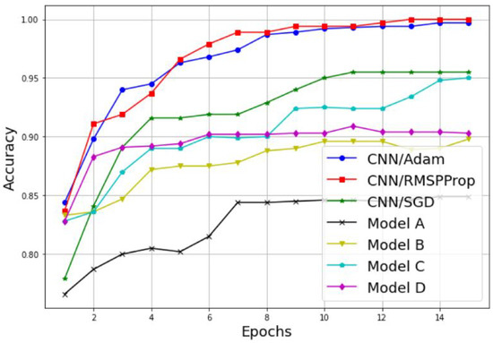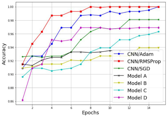 An alternative way to properly analyze the difference between the models in terms of accuracy is to display its variation as a function of the epochs, as illustrated in Figure 11 and Figure 12. As we can see, both the training and testing accuracies increase proportionally with the number of epochs for both techniques, the simple CNN without transfer learning and the models with transfer learning. Furthermore, it is clear that the CNN models without transfer learning achieve the highest results with a lower number of epochs, and then present a suitable choice for PU detection. For the training accuracy, the CNN model with RMSProp optimizer reaches 100% accuracy in 13 epochs, the CNN model with Adam optimizer reaches 99.74% accuracy in 14 epochs, and the CNN model with SGD optimizer reaches its highest accuracy value of 95.55% in 11 epochs. For the testing accuracy, the CNN model with RMSProp optimizer reaches 100% accuracy in eight epochs, the CNN model with Adam optimizer reaches 100% accuracy in 15 epochs, and the CNN model with SGD optimizer reaches its highest accuracy value of 98.18% in 10 epochs.