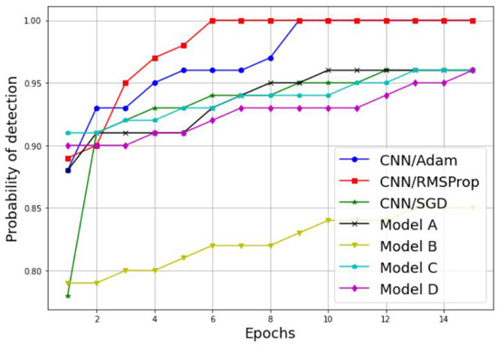 Further performance results of our comparative study are presented in Figure 13 and Figure 14, where the probability of detection and false alarm are plotted against the number of epochs. As we can see, the increases proportionally with the number of epochs, while the decreases proportionally with the number of epochs for both techniques, the simple CNN models without transfer learning and the models with transfer learning. In addition, the simple CNN models with the RMSProp and Adam optimizers achieve the best performances results in terms of and . For results, the CNN model with both the RMSPprop and Adam optimizers reached 100% of in six epochs and nine epochs, respectively. For the results, the CNN model with RMSPprop optimizer met 0% of in eight epochs and the CNN model with Adam optimizer met 12% of in 12 epochs.