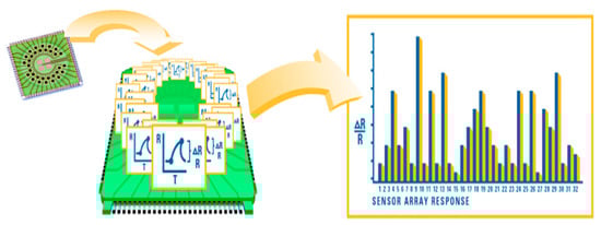 This is a commercially available handheld portable chemical vapor analyzer, containing a nano-composite array with 32 polymer sensors. When exposed to a gas mixture the sensors swell, thereby increasing their electrical resistance (ΔR/R). The combination of the 32 sensors ΔR/R results in a unique pattern, named “breathprint”, which can be stored and compared with others (Figure 2) [].