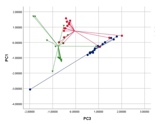 Although PC2 explained 17.5% of the total variance and PC3 7.5%, ANOVA on PC3 was more significant than on PC2 (p = 0.000 vs. p = 0.001, respectively, see Table 3). Therefore, we chose to use PC1 and PC3 for further discriminant analysis.