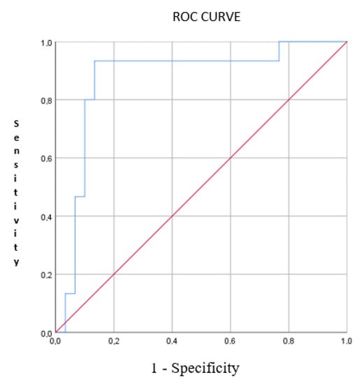 By means of the ROC curve, we used the Youden Index method to obtain the best cut-off of the model (0.4831760) in discriminating patients with HNC. Consequently, we calculated a sensitivity of 93.3%, a specificity of 86.6%, a positive predictive value (PPV) of 77.8% and a negative predictive value (NPV) of 96.2%