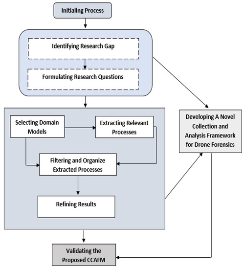 This is followed by the formulation of the research questions. Thereafter, the domain models are selected, and the relevant processes are extracted, which are then filtered and organized to aid in constructing a comprehensive forensic model for the collection and analysis. Finally, the proposed model is validated to assess its effectiveness.