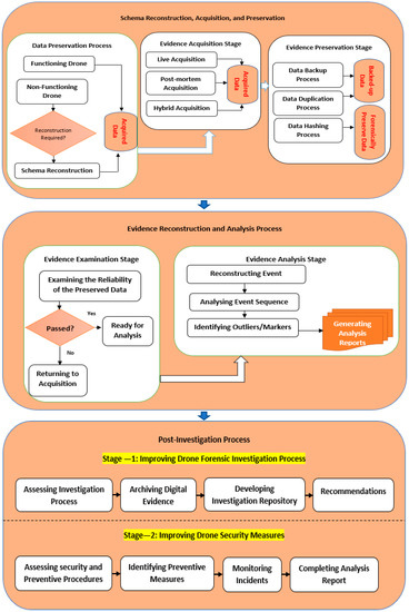 Due to the overlapping of some extracted processes, the tasks and activities performed in each of the investigative processes should have been considered, and there should not be a focus on naming conventions [22,23]. A more frequent process of investigation is selected by adapting the mapping process. The proposed forensic model is shown in Figure 4. It has three common investigation processes, i.e., collection and preservation, reconstruction and analysis, and post-analysis process. The extracted 21 collection processes were covered by the collection and preservation process, while the extracted 21 analysis and reconstruction processes were covered by the reconstruction and analysis process. The post-investigation process presented as a new process has not been stated in any of the existing models of drone forensics. Its two main goals are (1) the assessment and improvement of the current investigation processes based on a group of procedures that Section 5 highlighted and (2) the assessment and improvement of the existing drone security measures to prevent further drone incidents in the future, as indicated in Section 5.