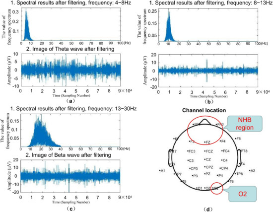 (a) Filtered spectral results and images of Theta waves in the O2 channel of subject 1. (b) Filtered spectral results and images of Alpha waves in the O2 channel of subject 1. (c) Filtered spectral results and images of Beta waves in the O2 channel of subject 1. (d) Subject 1’s channel location and the location of the selected channel.