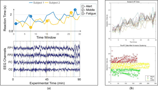 (a) The RT index was used to determine the navigating fatigue level. (b) Subject’s RT data after K-means clustering.
