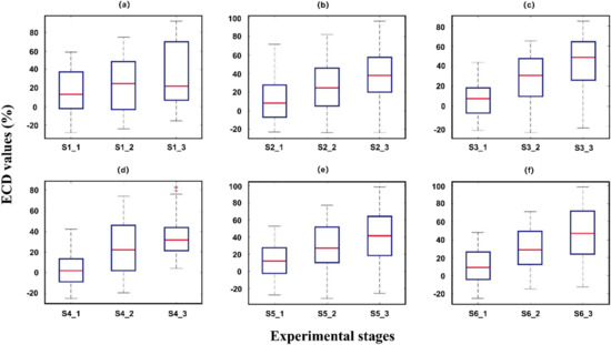 (a) ECD values of subject 1 in three periods of “alert”, “middle”, and “fatigue” respectively. The red line represents the median ECD value, and the upper and lower boundaries of the box are the upper and lower quartiles. (b) Subject 2’s ECD values. (c) Subject 3’s ECD values. (d) ECD values of subject 4 and the red cross stars indicate the outliers. (e) Subject 5’s ECD values. (f) Subject 6’s ECD values.