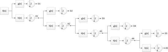 The DWT’s heart uses a series of high-pass and low-pass filters to analyze signals at different frequencies. High-pass and low-pass filters are denoted by and , respectively [17]. This paper decomposes the EEG signal into six sub-signals by a five-level decomposition of the db5 wavelet function, including D1, D2, D3, D4, D5, and A5. For the first level decomposition, results in D1 and A1 are the output of bypassing and , among that A1 is dominant in the frequency of the original signal. The approximation coefficient of each level is supposed to be decomposed continuously, and this process is repetitively executed four times to obtain the final sub-signals [18]. They are the frequency content of primary signals within the bands with fs/4–fs/2, fs/8–fs/4, fs/16–fs/8, fs/32–fs/16 and fs/64–fs/32, respectively, and the sixth subband A5 has a frequency range of 0–fs/64, among that the fs is 500 Hz. Each sub-signal in a different frequency domain on the officers’ current fatigue state, such as alpha waves (8 to 13 Hz) contained in the D5 (7.8 to 15.6 Hz) signals. In sleep research, changes in the alpha wave of EEG signal are considered the most reliable physiological marker of entering sleep [19]. The algorithm structure of five-level with wavelet decomposition for EEG signals is presented in Figure 5.