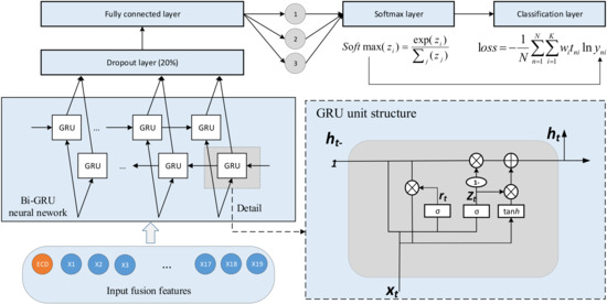 In this experiment, the number of single-layer GRU or LSTM units is 128, the minimum training step size of the network is 600, the maximum training rounds is 30, and the learning rate is 0.005. This paper sets the drop rate of the dropout layer as 0.2, and the output of the fully connected layer is 3, which corresponds to the three fatigue levels. The Bi-GRU network structure is shown in Figure 7.