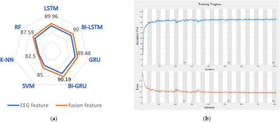 (a) The accuracy of classifiers under different features. (b) Training progress of BI-GRU network.