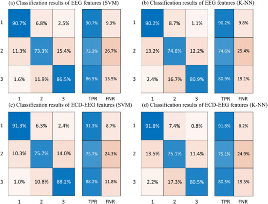 (a) Classification results of EEG features in the SVM classifier (Confusion matrix). (b) Classification results of EEG features in the K-NN classifier. (c) Classification results of ECD-EEG features in the SVM classifier. (d) Classification results of ECD-EEG features in the K-NN classifier.