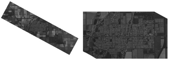 For some applications, when scans are taken from off-nadir angles (look-down-angle °), a good pretext task could be for a neural network to predict the scan angle or the azimuth angle of the satellite position during the scanning process. The information about it is contained in the metadata of the scan files. The main problem with such an approach is the fact that such a pretext task could lead to focusing only on buildings and other high, man-made (usual steel) objects and their shadows. The task itself requires imagery containing high objects and it is difficult even for human operators to deduce from the imagery. An example is shown in Figure 4.