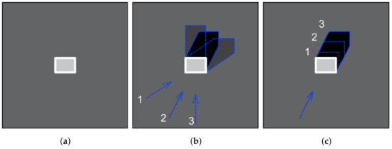 Image of a building (a) from close to nadir angle, (b) from constant Look-down/elevation angle and three azimuth angles, (c) from constant azimuth with different look-down angles (1 is the highest, 3 is the lowest).