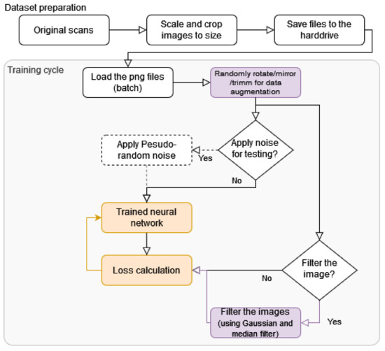 The labels or reference values (y) also have the following two paths: pass unmodified to perform classic training, perform filtering for the described training improvement. Passing without any alternation was used to create reference networks, which are juxtaposed in the Results Section. The applied filtering is described in Section 2.6. The filtering improves the achieved metrics as described in the Results Section (Table 1 and Table 2).