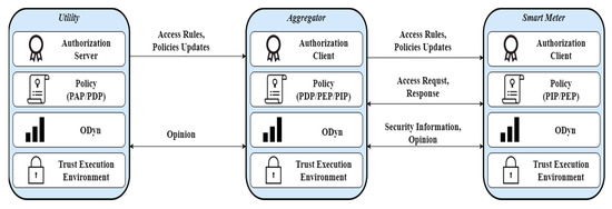 There are many ways to cope with the aforementioned challenges including but not limited to policy-based management. Thus, policy specification languages are utilized to communicate the various authorization policies in numerous access control applications with complicated policies. A well-known as well as commonly used language in SG ecosystems is the XACML [16], which is used to construct complex authorization policies [17]. The entities that participate under the policy manner are the following: (i) Policy Enforcement Point (PEP): this is responsible for performing the decision requests, receives policy updates and accordingly translates them, as well as enforces the decisions that stem from each policy. (ii) Policy Decision Point (PDP): this assesses the applicable policy against other relevant policies and attributes providing the decision outcome to PEP. (iii) Policy Information Point (PIP): this acts as a source of attribute values to make a policy decision. (iv) Policy Administration Point (PAP): this provides the authoring and the maintenance of a policy or a set of policies. As we can observe, in the SG ecosystem the participating entities own numerous titles. For instance, a Utility in a domain may also be a PDP. That leads to the fact that the different roles can be allocated to an entity being hardcoded in a device. Figure 1 shows the involved entities and the flows between them.