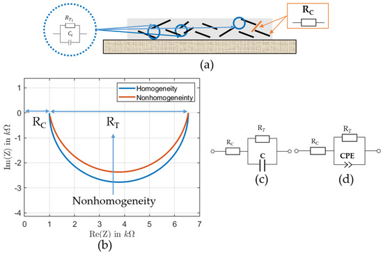 (a) Impedance contributions of MWCNTs and MWCNT gaps to the total impedance of the nanocomposite; (b) exaggerated behavior of the impedance spectrum of a homogeneous and nonhomogeneous MWCNT nanocomposite; (c) equivalent circuit for a homogeneous nanocomposite; (d) equivalent circuit for a nonhomogeneous nanocomposite.