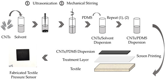 In order to exploit the potential of the multiwalled carbon nanotubes (MWCNTs) in PDMS, they need to be dispersed homogeneously in the polymer. However, achieving a homogeneous dispersion of MWCNTs in PDMS remains challenging due to the van der Waals attraction force between the MWCNTs, resulting in a reagglomeration of the MWCNTs [27]. Based on our prior experience, tetrahydrofuran (THF) has shown potential for the stable dispersion of MWCNTs in PDMS [25,28]. MWCNTs with an outer diameter of 6–9 nm, an average length of 1 µm, and carbon purity of >95% purchased from Sigma-Aldrich were used as conductive nanofillers, and PDMS (Sylgard 184 Kit) as a base polymer was purchased from Dow Corning. An optimized concentration of 0.3 wt.% of MWCNTs nanocomposite material in PDMS was chosen [25,28]. The dispersion was performed first by a 15-min ultrasound treatment using a Bandelin Sonopuls HD 3200 at an amplitude of 30%, and 15-min magnetic stirring using a CAT M27 at 1500 rpm and a temperature of 70 °C. Subsequently, 5 g of PDMS was added, and the process steps of ultrasonic treatment and magnetic stirring were repeated. In the final step, the hardener was added at a ratio of 10:1 (PDMS/hardener), which was optimum for maintaining the mechanical and electrical properties of PDMS after adding the MWCNTs in it. Once the hardener was added, it needed to be screen printed on the textile substrate within a few hours. A commercial textile was used as a substrate for the sensor. The complete process of the sensor fabrication is shown in Figure 3.