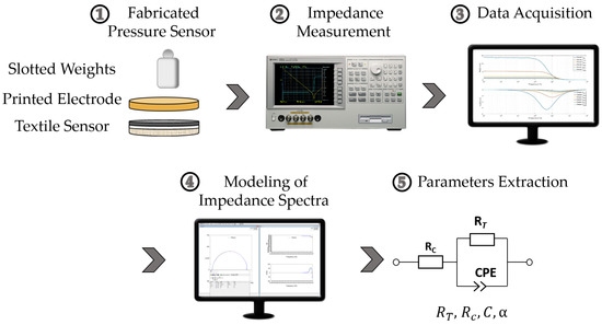 On the other hand, electrical-based methods such as resistance, capacitance, and impedance measurements can be used to characterize the fabrication method’s efficiency in measuring the electromechanical performance of the sensors. In [17], a flexible pressure sensor was fabricated using PDMS/MWCNTs at 0.1 wt.% and characterized by resistance measurements. The results showed that the resistance dropped drastically as the pressure increased to 7 mmHg, gradually decreasing to 20 mmHg. The van der Pauw method is a four-point resistivity measurement technique and is commonly used for resistivity measurement, sheet resistance, and the Hall coefficients of sensitive films. In [18], the van der Pauw method was applied to optimize the fabrication method, electrode size, and electrode shape of graphene oxide (GO)-based cotton electrodes for electrocardiography (ECG) application. However, the van der Pauw method has many disadvantages as it needs an absolute calibration of the nanovoltmeter, a good contact to reduce the influence of the contact resistance, and for every condition, many measurements should be carried out. Furthermore, this method can not provide information about the capacitive behavior of the sensor. In other works [19], capacitive measurements were used to characterize capacitive sensors printed on a flexible textile substrate. The resistance and capacitance techniques have been implemented mainly separately and have not yet been comprehensively implemented to provide information about the complex conduction mechanisms of nanocomposites [20,21]. In [22], a piezoresistive strain sensor was characterized using impedance spectroscopy. The equivalent circuit of the impedance spectra was a parallel combination of resistance in parallel with a constant phase element (CPE). The sensor showed frequency-independent and frequency-dependent characteristics under the applied frequency. Impedance spectroscopy is attractive as a real-time and nondestructive characterization technique [23]. It is a frequency-dependent method that provides information about the change in piezoresistivity, the conduction mechanism of the sensor, its reproducibility, and the polymer and the complex network of the MWCNTs [21]. It can be integrated easily as the last step in the production process for quality control.