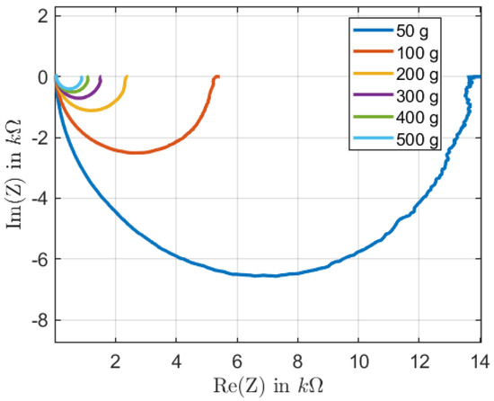 The impedance measurements showed that the samples exhibited a resistive behavior when measured without an applied weight. The lack of percolation paths explained this behavior. The neighboring MWCNTs were too far apart, resulting in a too-small capacity. As the weight increased, the sample’s impedance exhibited a quasi-semicircular behavior. The semicircle diameter decreased as the sample was exposed to more weight. A significant change in both the capacitive and resistive components occurred due to the structural change of the sample, as shown in Figure 5.