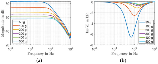 Figure 6 shows that the frequency response of the MWCNTs/PDMS nanocomposite pressure sensor depends on the weight ranging from 50 g to 500 g. The nanocomposite sensor exhibits two different behaviors depending on the frequency range: frequency-independent (low frequencies up to the critical frequency, ) and a frequency-dependent response. In the low-frequency range, MWCNTs resistive networks dominate the conduction mechanism, and consequently, the impedance response remains constant until the critical frequency is reached. For instance, while the at 50 g load is 3.09 kHz, it shifts to 229.1 kHz at a 500 g load. This can be explained by the charge carriers that flow over capacitive networks at higher frequencies than the critical frequency, proving the dominance of capacitive paths in the conduction mechanism. According to Figure 6a, at low frequencies, the magnitude decreases from 83 dB to 59 dB at 100 Hz, corresponding to 28% of change. The sensor shows a capacitive behavior at the critical frequency, and the impedance amplitude decreases rapidly. Figure 6b shows the change of Im(Z) as a function of the applied frequency. In this case, it can be seen that Im(Z) exhibits two distinct characteristic regions depending on the operating frequency, and the imaginary part Im(Z) increases with an increasing applied load. The sensitivity to load is higher in the low-frequency range up to 100 kHz.