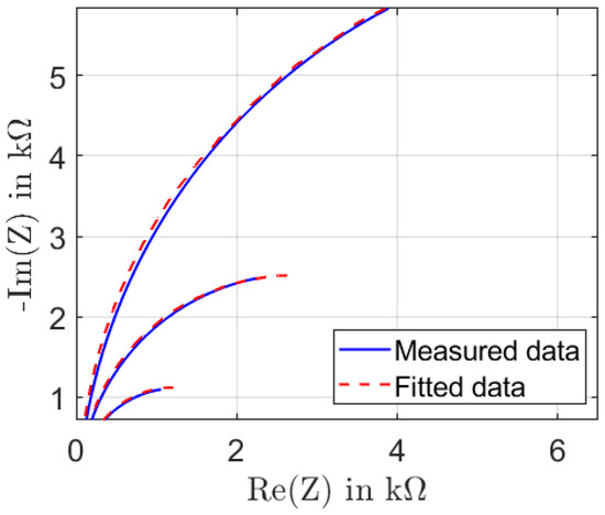 In order to extract the equivalent circuit parameters to study the homogeneity of the samples, we fit the measured data to the model in Figure 2d. As shown in Figure 7, the measurement data were noisy at low frequencies due to the limitations of the measurement equipment in this impedance region. Therefore, we decided to fit the model to the half of the impedance spectrum with better data quality. The data were fitted using Zview software.