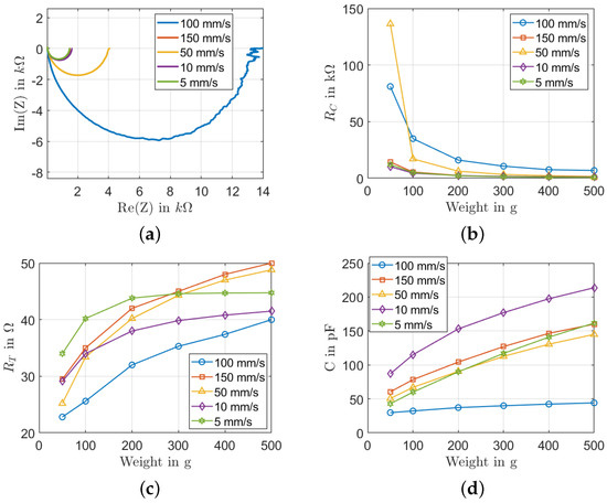 Influence of the squeegee speed: (a) Nyquist plot for a load of 300 g; (b) change with different loads; (c) change with different loads; (d) C change with different load.