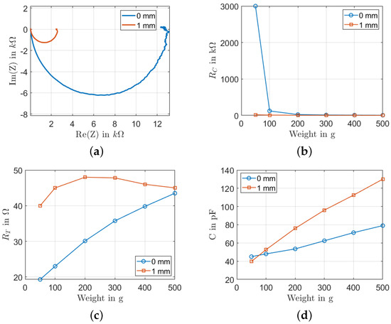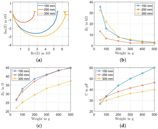 Three squeegee heights were tested for screen printing: 150 mm, 250 mm, and 300 mm. In Figure 9a, the Nyquist plot shows that the the sample printed with a squeegee height of 300 mm has the widest semicircle. In Figure 9b, the exhibits a constant behavior for loads higher than 200 g for all the samples with a resistance of around 5 k. This behavior can be explained by the improved contact between the electrode and the sensor when the load increases. For the resistance in Figure 9c, both samples with squeegee heights of 150 mm and 250 mm have similar values. The sample with a squeegee height of 300 mm exhibits a lower value of , indicating the existence of longer percolation paths between MWCNTs in the film, contributing to the total impedance in series to each other. The tunneling capacitance decreases when the height increases indicating the existence of more elementary capacitances along the percolation paths between MWCNTs, contributing to the total impedance in series to each other. Both the tunneling resistance and the tunneling capacitance increase when the acting force increases. In the case of interdigitated electrodes, the acting forces let more MWCNTs move towards the region with a stronger field between the interdigitated electrodes. This is why both C and increase with the increase of the applied weight.