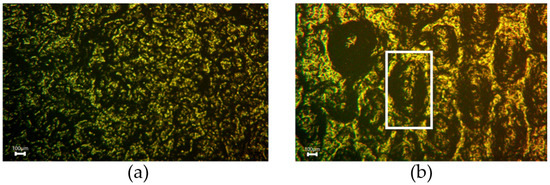 In order to visualize the quality of the MWCNTs/PDMS nanocomposite in the fabric and the surface’s homogeneity, the samples were investigated by microscope imaging. Some examples are given in Figure 11, where the morphology of two sensors realized with different printing parameters are shown. In Figure 11a, the microscopic image of sensor S3 is shown, which was fabricated with the following printing parameters: squeegee speed of 50 mm/s, squeegee height of 200 mm, and snap-off distance of 0 mm. The realized MWCNTs/PDMS film is homogeneous. Figure 11b illustrates the microscopic image of the sensor S11, which was fabricated with the following parameters: squeegee speed of 100 mm/s, squeegee height of 200 mm, and snap-off distance of 1mm. The deposited layer is, in this case, not homogeneous, and bubbles are visible. That can be explained by the high printing speed as the squeegee speed affects the amount of material flowing into the mesh of the openings in the fabric. The faster the speed, the fewer materials penetrate the fabric. Furthermore, the snap-off distance is critical in screen printing. When the distance between the squeegee and the textile is low, more pressure is applied, and a thin layer of material can be deposited in the substrate. The latter ensures a minimum air gap and fewer air bubbles on the surface.