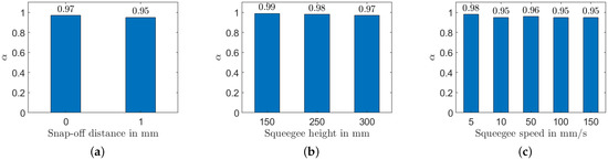 As shown in Figure 12a, two snap-off distances were compared: 0 mm and 1 mm. The sample had an equal to 0.97 when the snap-off equaled 0 mm. This indicated a better homogeneity, which could be explained by a reduced distance between the substrate and the squeegee resulting in more pressure on the substrate. When the snap-off distance was increased, the penetration of nanocomposite material inside the textile substrate was not homogeneous, which resulted in a nonuniform surface of thin films and a nonhomogeneous distribution of MWCNTs in PDMS. Four different heights were considered for the squeegee height: 150 mm, 250 mm, and 300 mm, as shown in Figure 12b. The parameter decreased, so using a squeegee at a short height was better for a more homogeneous sample. Finally, the of the squeegee speed was compared. Five different speeds were considered: 5 mm/s, 10 mm/s, 50 mm/s, 100 mm/s, and 150 mm/s, as illustrated in Figure 12c. The changes decreased from 0.98 to 0.95, when the squeegee speed increased. When the squeegee speed was high, the MWCNTs/PDMS material did not have enough time to penetrate perfectly into the textile’s fiber matrix. Furthermore, the high speed resulted in the formation of air bubbles in the deposited layer of the MWCNTs/PDMS. Choosing a low snap-off distance, small squeegee height, and low squeegee speed is therefore suggested to fabricate a high-quality textile pressure sensor with good homogeneity. Finally, implementing the parameter in the production process is a valid method as the last step for quality checks.