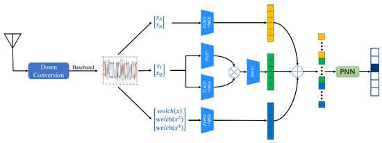 Firstly, the multiple transformation domain can provide multimodal information, so the I/Q waveform, modulus and phase of the received signals, as well as welch spectrum, square spectrum, and fourth power spectrum are extracted from the perspective of the time-frequency domain as network input [15]. Then, we consider the way the networks learn and incorporate multimodal features. RSBU-CW12 is designed to extract spatial features of signals. Inspired by [16], the raw I/Q signals are fed into the LSTM and the RSBU-CW12 to extract the temporal and spatial features of the signals, and then the outer product operation is performed to increase the diversity of features. Since the outer product can bring feature-dimension expansion, a fully connected layer is used to reduce the feature dimension. The modulus, phase, and spectrum features are fed into the RSBU-CW12 to extract their respective features. For the three groups of features extracted from the I/Q waveform, modulus and phase, as well as the welch spectrum, square spectrum, and fourth power spectrum, the method of direct concatenation to the full connection layer cannot achieve the full fusion of features. We adopted the PNN model to carry out feature cross-fusion for the features extracted from the network, so that the model can capture more key information.