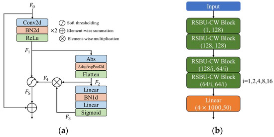 Deep residual shrinkage network model. (a) RSBU-CW Block; (b) RSBU-CW12.