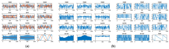 In the signal preprocessing stage, different domain transformation features of the received signals are extracted from the perspective of the time-frequency domain. The I/Q waveform, modulus and phase, welch spectrum, square spectrum, and fourth power spectrum are taken as network inputs. Figure 3 shows the time-frequency domain feature inputs of 12 kinds of modulation types when SNR = 18 dB.