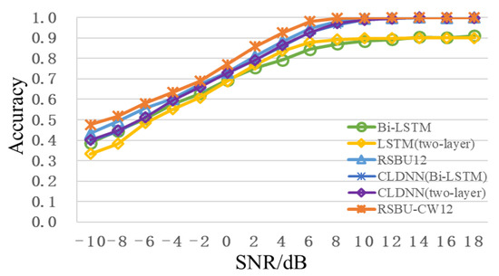 Compared with Figure 2b and Figure 6c, RSBU-CW12 is RBU12 an added sub-neural network with soft thresholding. Simultaneously, edge filling is carried out before each convolution to keep boundary information. I/Q waveform serves as network input to compare the performance of RSBU-CW12 with several other common modulation recognition network models, as shown in Table 3. As can be seen from Table 3, recognition performance of RSBU-CW12 is better than that of other network models. Compared with CLDNN(Bi-LSTM), which ranks second in overall recognition accuracy, recognition performance of RSBU-CW12 is increased by 3.62%.